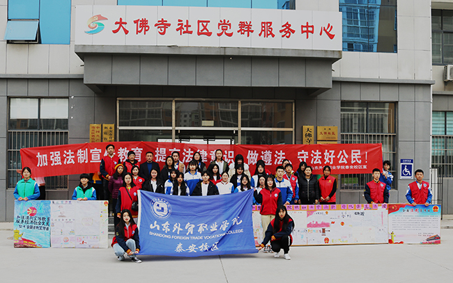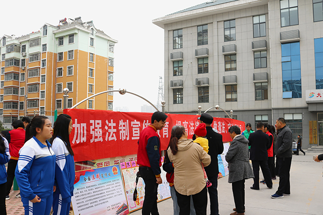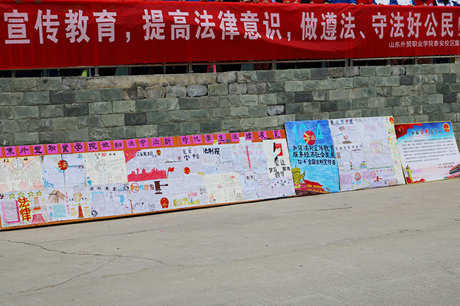当天上午,教研室满丽、邵玲两位老师指导学生结合所学法律知识制作了内容丰富、形式多样的宣传海报,在校区进行展览。下午,教研室主任任勇和满丽、邵玲带领各级部学生代表、团总支成员、德育社团和法制社团的30余名同学,走进“手拉手”活动联谊社区——泰安市岱岳区粥店办事处枣行社区和大佛寺社区,将同学们制作的法律宣传海报向社区居民进行展示讲解,宣传法制知识,受到社区街道干部和居民的好评。