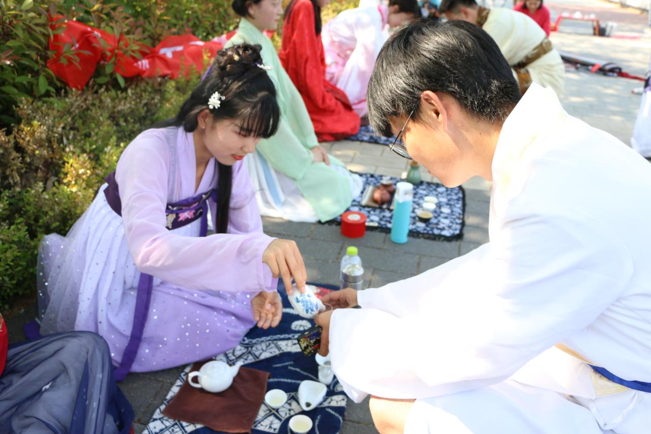 无我茶会是一种“大家参与”的茶会,由台湾陆羽茶艺中心蔡荣章先生创办。其特点是参加者自带茶叶茶具、人人泡茶、人人敬茶、人人品茶,一味同心。活动中,学生将泡好的茶分于四只杯中,自己留一杯放在泡茶巾的最右边,然后奉茶盘将另外三杯奉给左侧三位茶友,受茶人行茶礼接受,待四杯茶奉齐,最后进行品饮,充分体现了无我茶会无尊卑之分、无好恶之心、无“报偿”之心的文化精神。品茶后,嘉宾周蕾演奏了古琴名曲《阳关三叠》,高级茶艺师韩蕾蕾等人表演了《无我行茶十式》,六羡歌茶艺社表演了《君子茶道十二式》,将活动气氛推向了高潮。