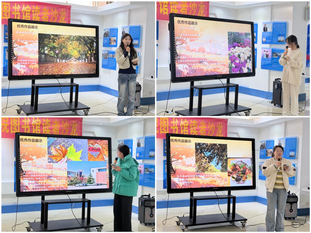 在前期线上征集活动中脱颖而出的四位同学首先展示了他们的落叶创意作品。这些作品或以累累果实传递秋日的丰饶喜悦,或借落叶铺就的小径勾勒深秋的静谧意境。一叶一世界,每一幅作品都以叶为媒,生动诠释着秋的韵味,为在场同学带来了丰富的灵感与启发。