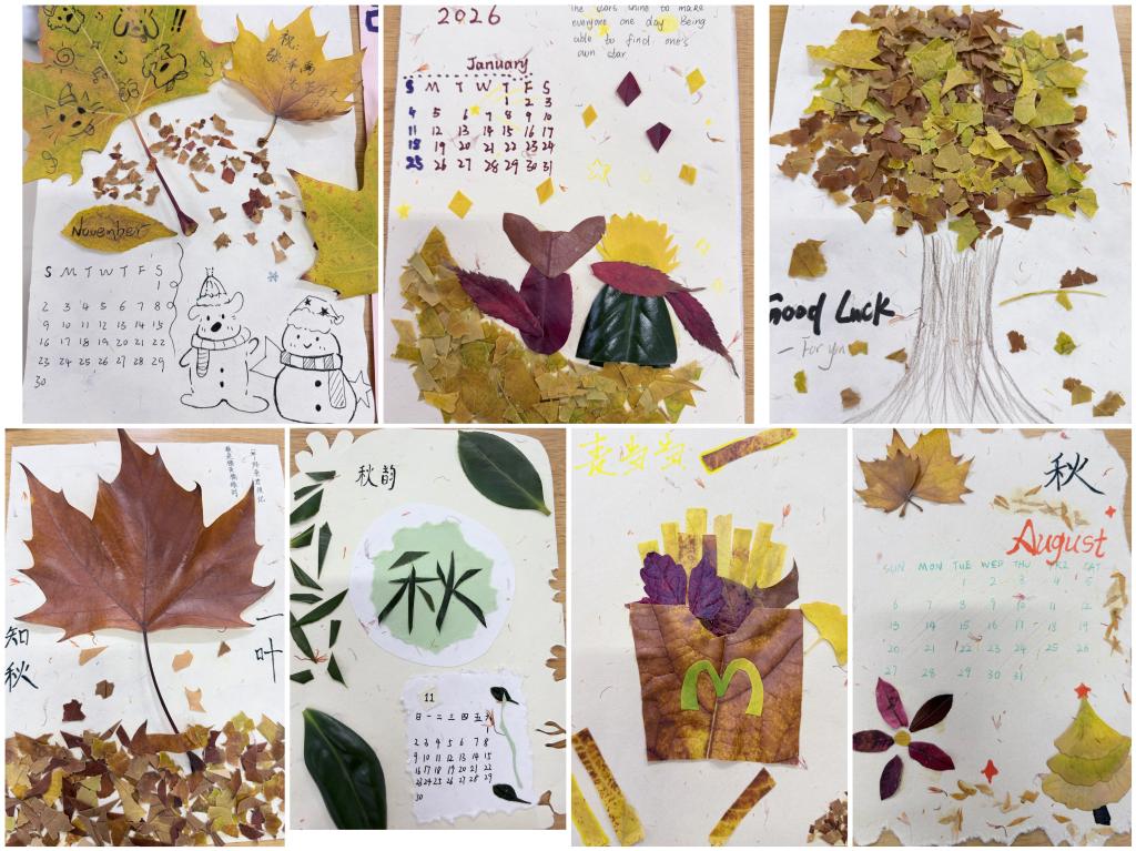 随后的日历制作环节中,同学们以落叶为创作素材,以时光为设计主题,在方寸之间拼贴出属于自己心中的秋天。活动现场大家或精心挑选落叶材料,或细致构图粘贴,在四十五分钟的专注创作中,完成了一页页独具匠心的秋日手札。创作结束后,多位同学踊跃分享了作品背后的故事与寓意:有的将梧桐叶片铺展为一条“金色大道”,象征求学之路的熠熠生辉;有的以枫叶拼贴成“振翅之蝶”,寓意成长路上的蜕变与飞翔。每一段讲述不仅展现了同学们的巧思与情感,也传递出大家对季节流转的细腻感知与生命体悟。