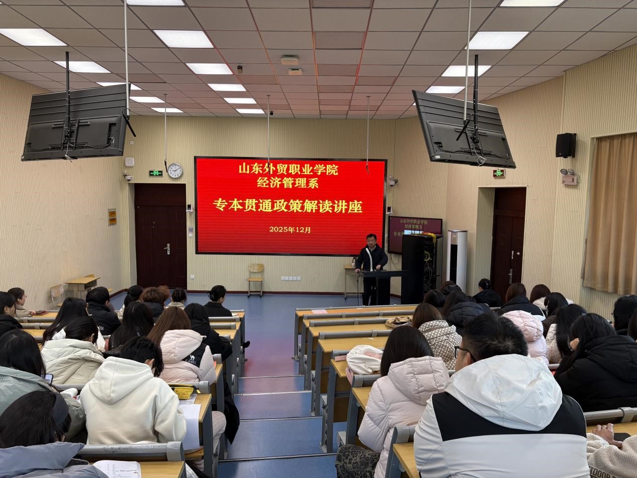 12月5日,经济管理系在1号楼3阶为2025级专本贯通学生举办政策解读会,系主任谭书旺为全体2025级专本贯通学生及相关教师就相关政策要求和培养方式进行了全面解读。