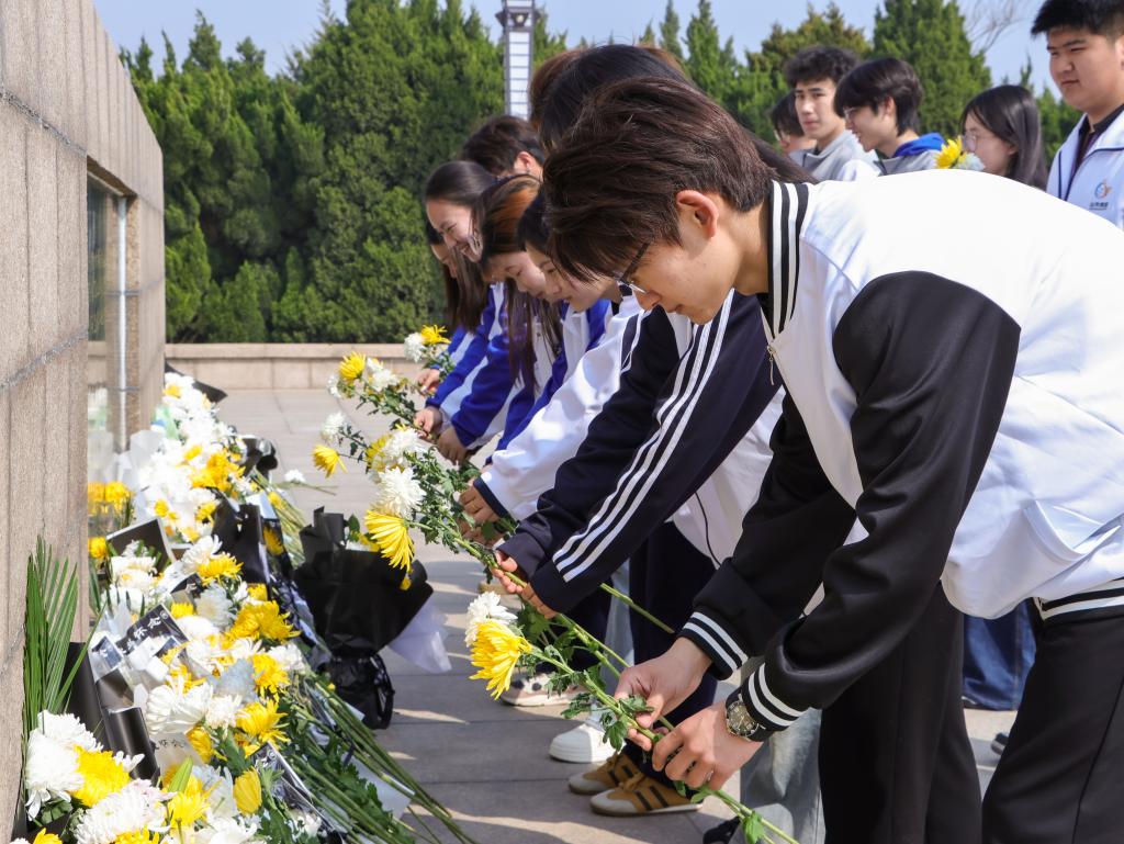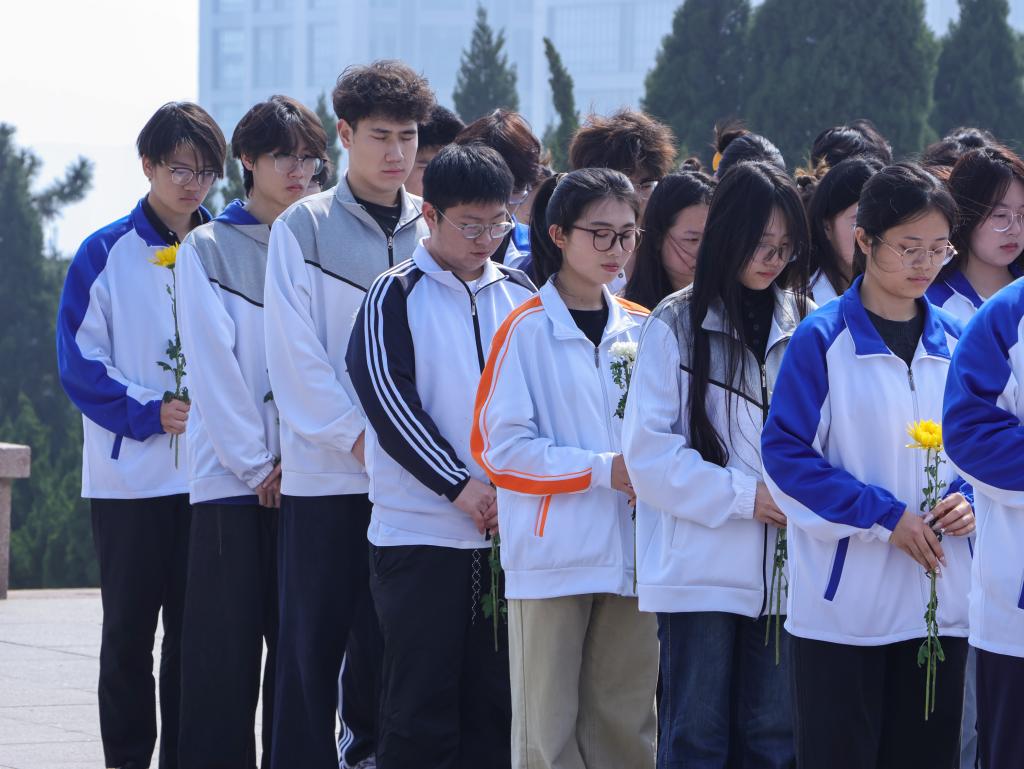 奏唱国歌结束后,全体师生垂首肃立,向为民族独立、人民解放和国家富强而英勇献身的革命烈士默哀。全场寂静无声,唯有微风轻拂松柏,仿佛在诉说着对英雄的无尽思念。师生们用最朴素、最庄重的方式,向长眠于此的先烈们致以最深切的哀悼和崇高的敬意。