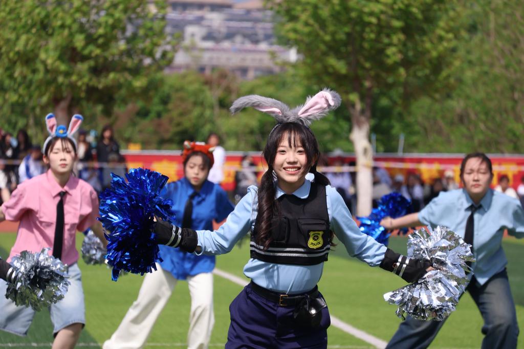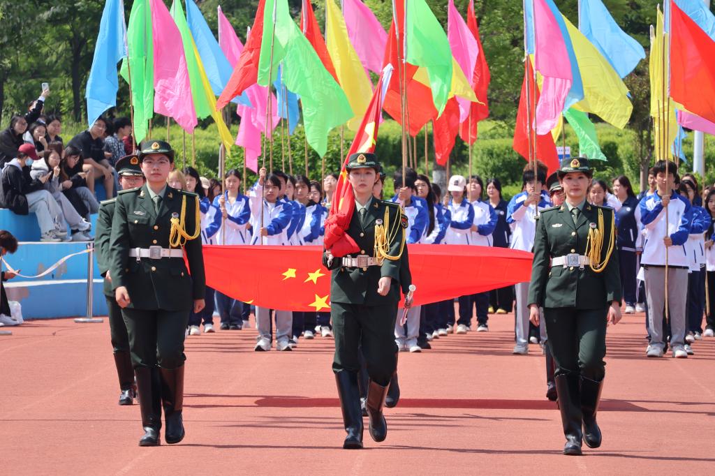 开幕式上,伴随着激昂的运动员进行曲,国旗护卫队、彩旗方队及各班运动员方队昂首阔步,步履铿锵地依次走过主席台接受检阅;裁判员代表和运动员代表庄严宣誓,承诺将恪守赛场纪律,弘扬体育风尚;团体操表演环节,学生手握花球,脚踏鼓点,随节奏舞动跳跃,为赛事注入青春活力。