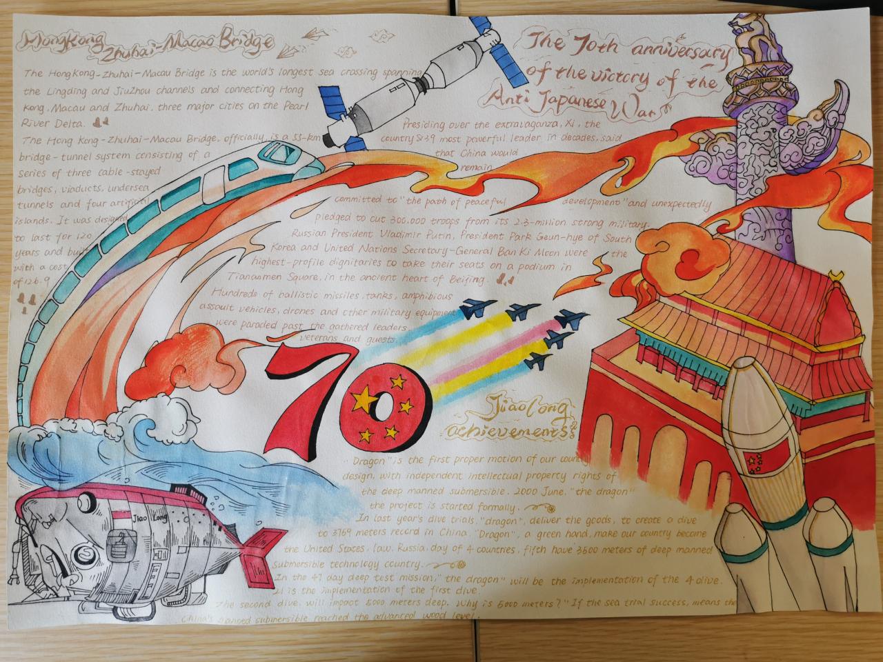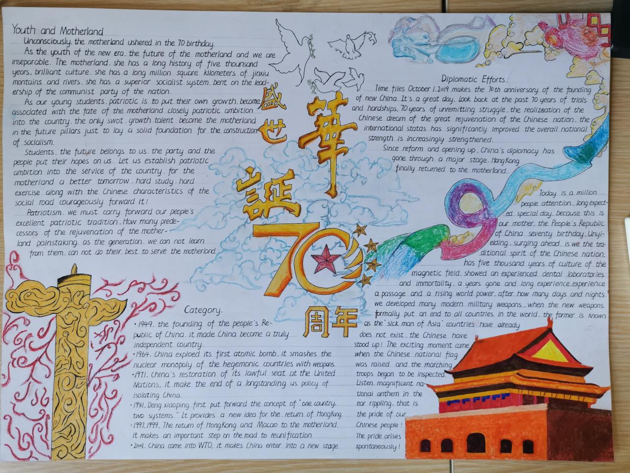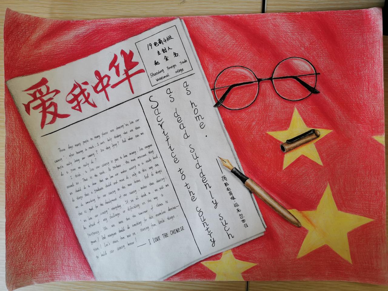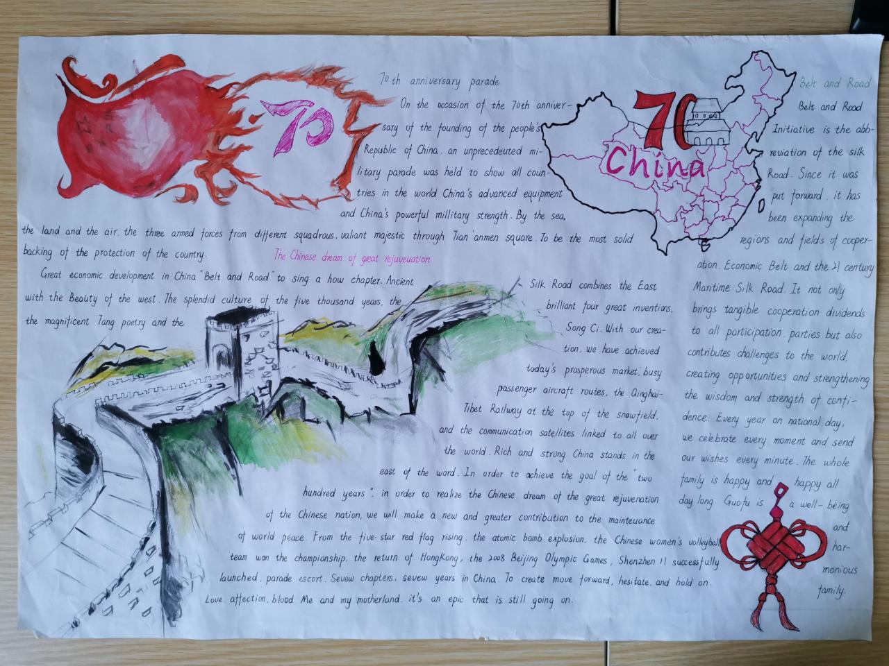 时值祖国七十华诞之际,为更好地践行“不忘初心、牢记使命”主题教育,近期,公共英语部与英语俱乐部联合举办了以“我和我的祖国”为主题的英语手抄报比赛。